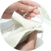 真珠は、汗、手垢、油、化粧品などの影響を受けます。使ったら、その都度柔らかい布や鹿皮などで優しく拭くようにしましょう。ひどく汚れたら無理な扱いをせず、真珠専門店に相談してください。